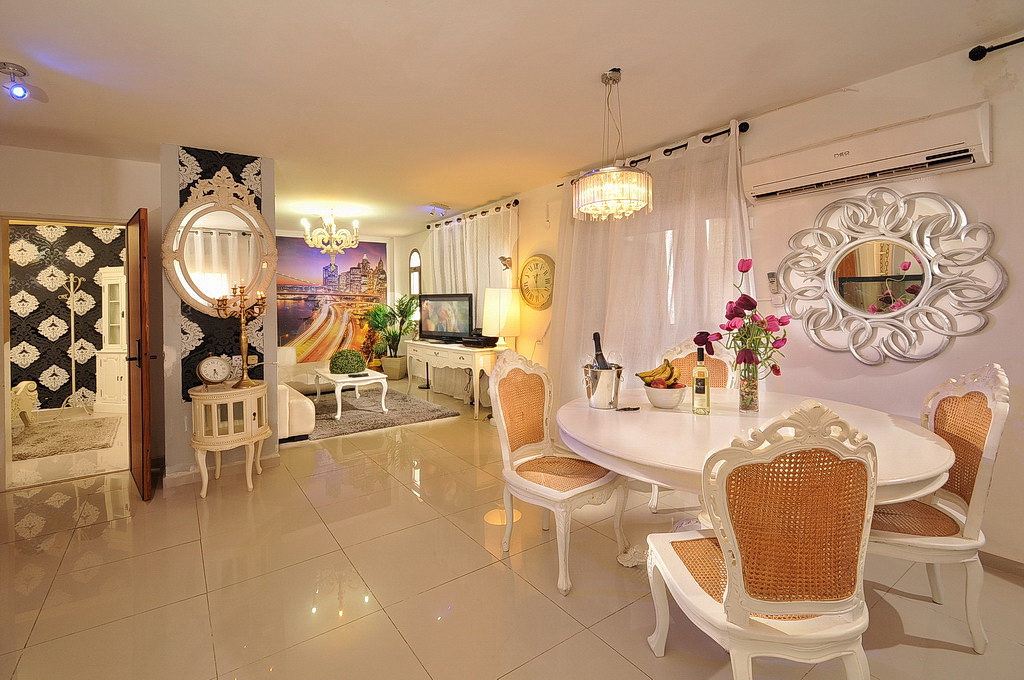 • חדר שינה רומנטי יוקרתי ובו מיטה זוגית מעוצבת נוחה במיוחד. חדר רחצה יוקרתי LCD בכבלים פינת אוכל מטבח עם מקרר גדול, קומקום, מיקרוגל, כלי מטבח.